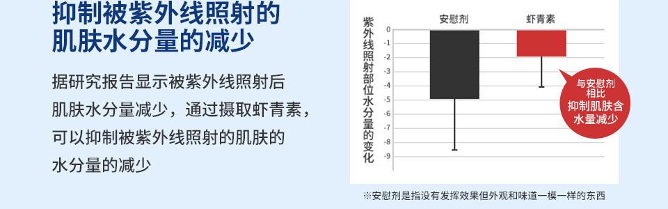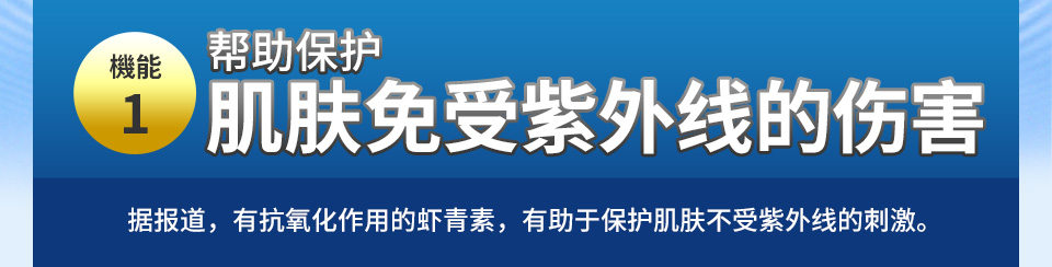 1天1粒中还有4mg的功能性相关成分虾青素。据报道,虾青素具有通过维持肌肤保湿力(屏障功能)来保护肌肤滋润的功能。另外,有抗氧化作用的虾青素,有助于保护肌肤不受紫外线的刺激。