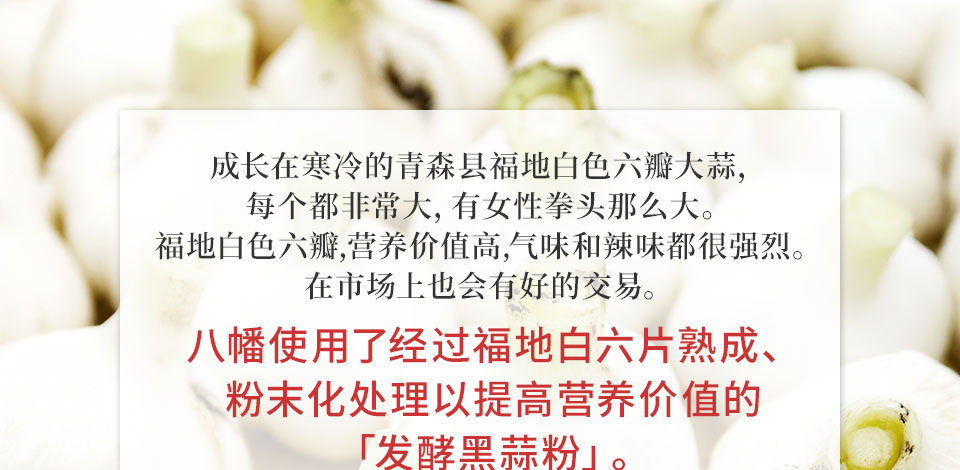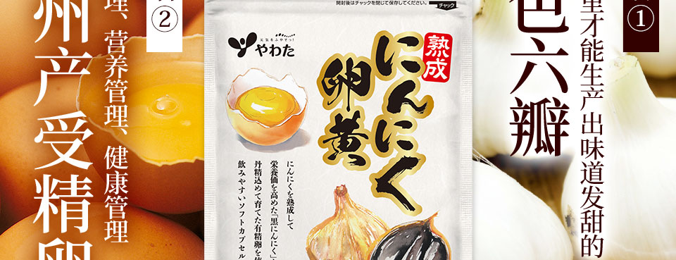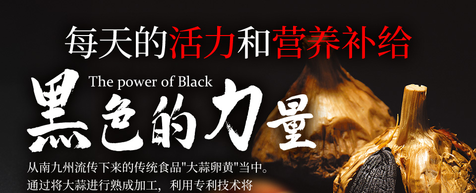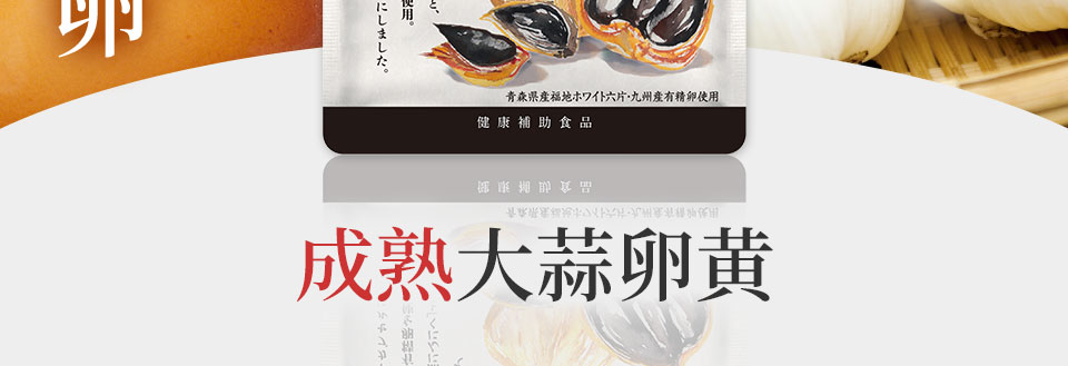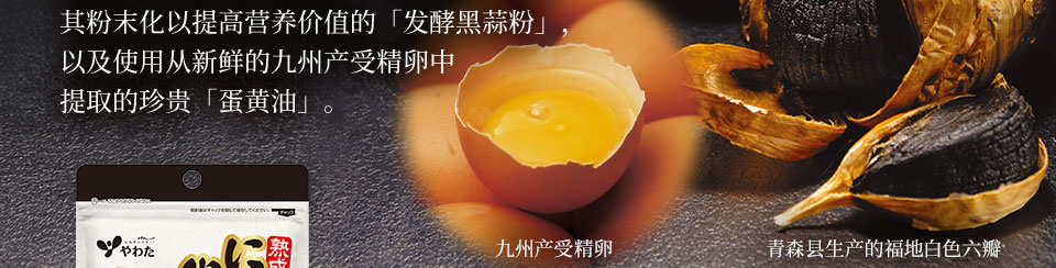 从南九州流传下来的传统食品"大蒜卵黄"当中。通过将大蒜进行熟成加工,利用专利技术将其粉末化以提高营养价值的「发酵黑蒜粉」,以及使用从新鲜的九州产受精卵中提取的珍贵「蛋黄油」。
