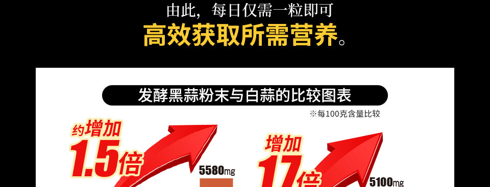 | 原料名称 | 发酵黑蒜粉(日本生产)、食用油脂、蛋黄油(含鸡蛋) / 鱼明胶、甘油、增稠剂(蜂蜡)、甘油脂肪酸酯、植物卵磷脂(大豆来源) |