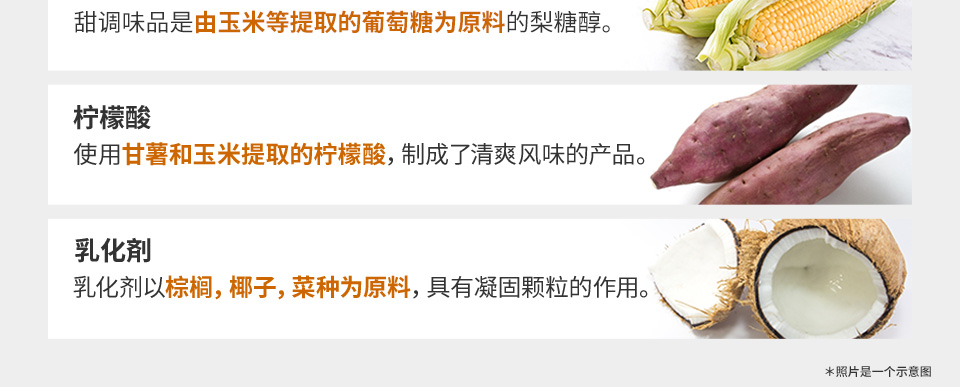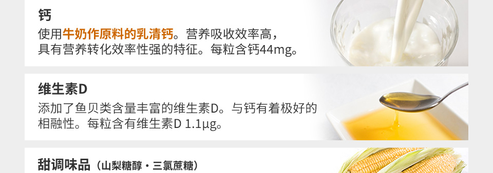 | 原料名称 | 乳清钙(美国生产)(含有牛奶)、麦芽糖 / 甜调味品(山梨糖醇、三氯蔗糖)、甘油脂肪酸酯、香料、柠檬酸、维生素D |