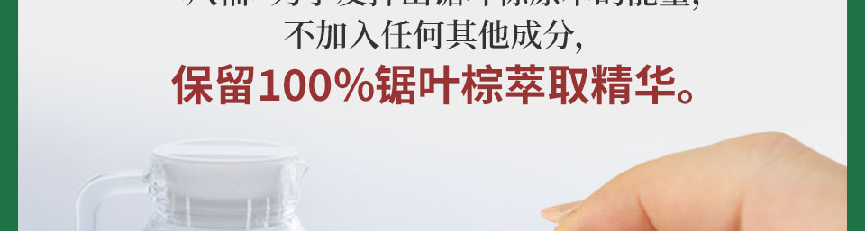 八幡的【锯叶棕】每日标准1粒中含有足量的锯叶棕萃取物320mg。<八幡>为了发挥出锯叶棕原本的能量,不加入任何其他成分,保留100%锯叶棕萃取精华。