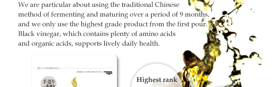 Vinegar contains plenty of amino and organic acids. It is produced thanks to craftsmanship and years of experience and is a great source of energy. At "Yawata", we are particular about using the traditional Chinese manufacturing method, which uses yeast that is difficult to handle and ferments and matures for a period of 9 months. We use only the first pour of the vinegar, which has a higher concentration of amino acids and organic acids.