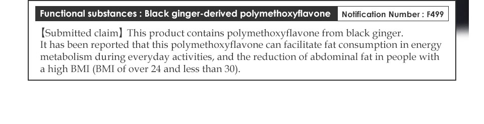 | Submitted claim | This product contains polymethoxyflavone from black ginger. It has been reported that this polymethoxyflavone can facilitate fat consumption in energy metabolism during everyday activities, and the reduction of abdominal fat in people with a high BMI (BMI of over 24 and less than 30). |