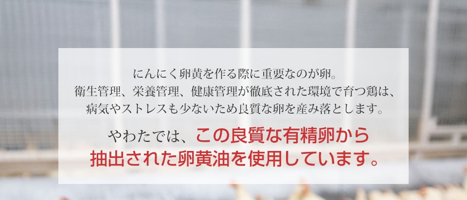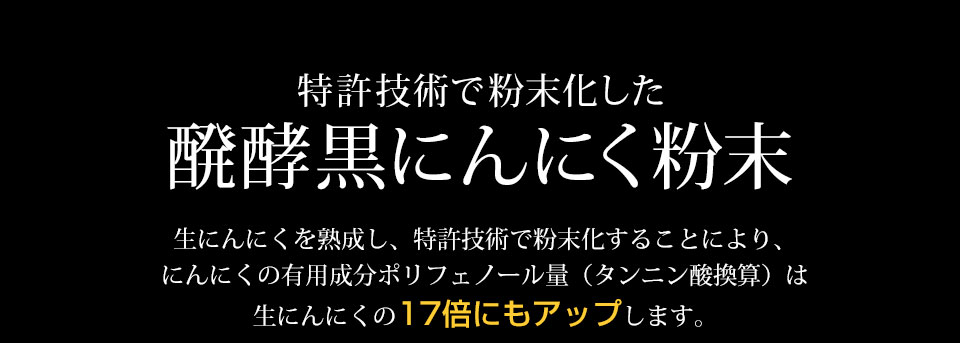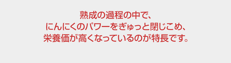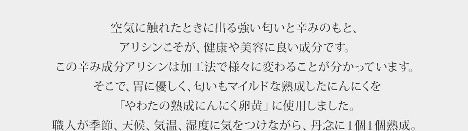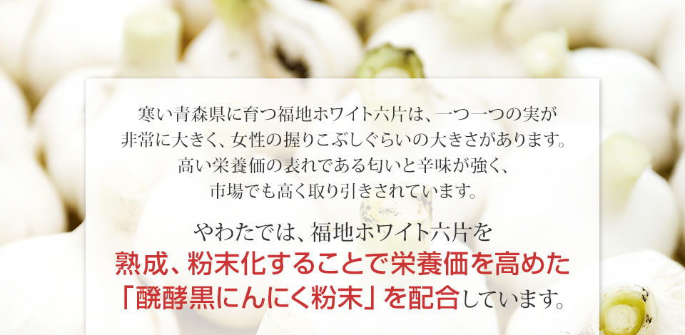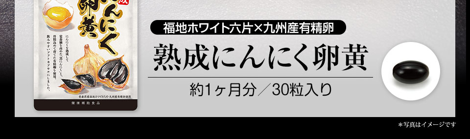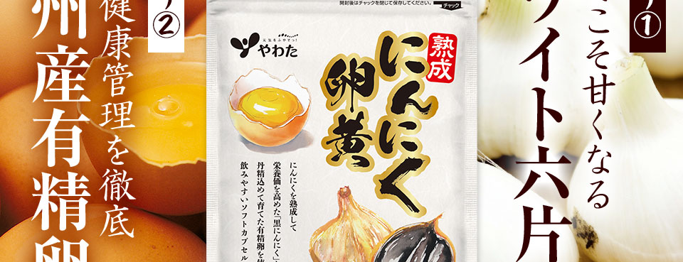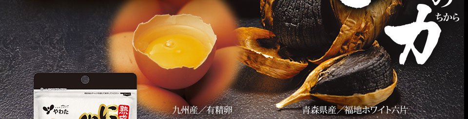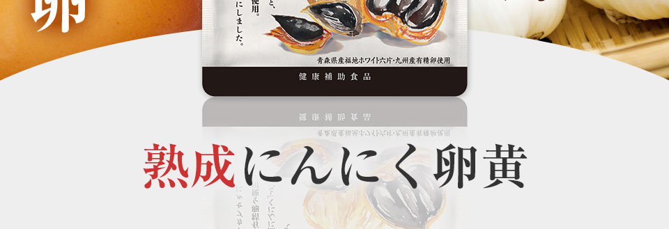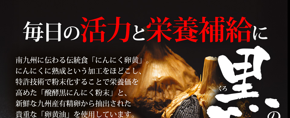 南九州に伝わる伝統食「にんにく卵黄」。にんにくに熟成という加工をほどこし、特許技術で粉末化することで栄養価を高めた「醗酵黒にんにく粉末」と、新鮮な九州産有精卵から抽出された貴重な「卵黄油」を使用しています。