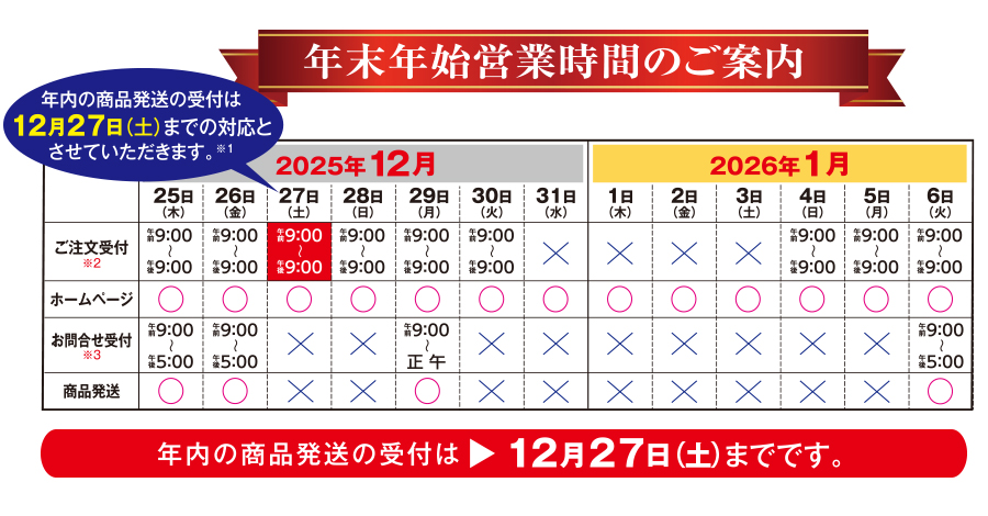 ・年内の受付最終日は 12月30日(火) です。年始の注文受付は 1月4日(日) より再開いたします。