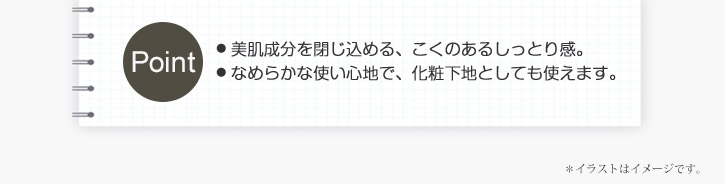 肌を保護すると同時に、美容液などで与えた美肌成分を閉じ込めて持続させます。